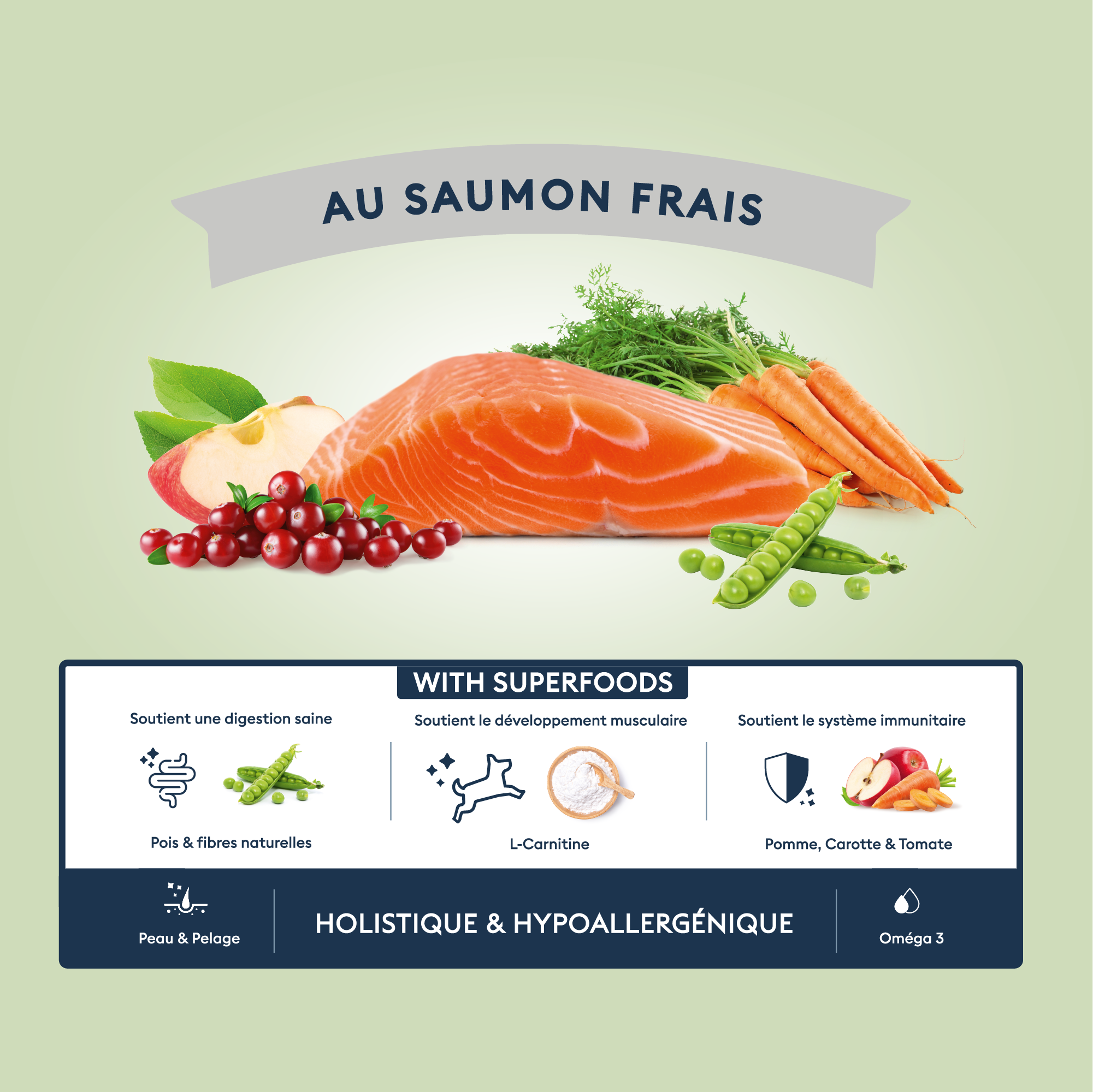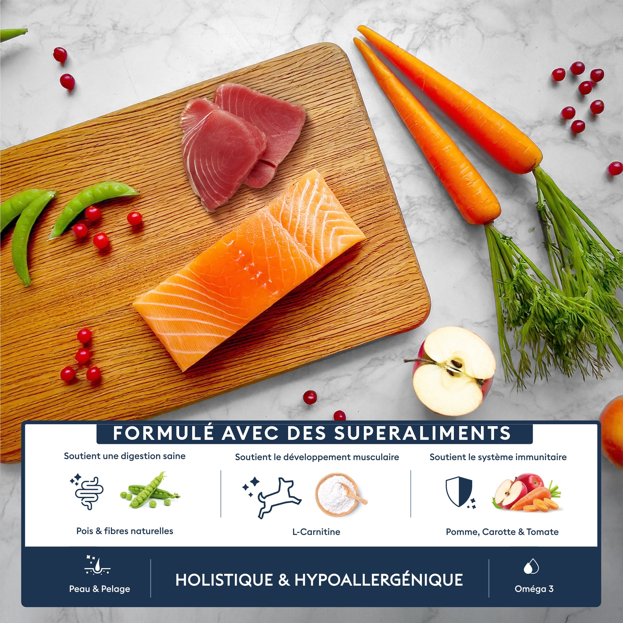 Poisson blanc (31%), poisson bleu (30%) (saumon frais 26%, thon (2%), protéines de poisson hydrolysées (2%)), amidon de pois, graisse animale (9%), tapioca, pois, pulpe de betterave, minéraux, fibres végétales, carottes (0,5%), pomme (0,5%), tomate (0,5%), chicorée (source de FOS), canneberges, parois cellulaires de levure (source de MOS et de bêta-glucanes) (0,075%), glucosamine (0,045%), sulfate de chondroïtine (0,035%), Yucca schidigera. Vitamines : A 30000 UI, vitamine E 500 mg, vitamine C 250 mg, taurine 1500 mg, L-carnitine 300 mg. Oligo-éléments : Fer (sulfate de fer (II) monohydraté) 64 mg, Cuivre (sulfate de cuivre (II) pentahydraté) 7 mg, Cuivre (chélate de cuivre (II) d'acides aminés hydraté) 3 mg, Manganèse (sulfate de manganèse monohydraté) 35, 2 mg, Manganèse (Chélate de manganèse d'acides aminés hydratés) 5 mg, Zinc (Chélate de zinc d'acides aminés hydratés) 40 mg, Zinc (Sulfate de zinc monohydraté) 103 mg, Iode (Iodate de calcium anhydre) 1,5 mg. Antiagglomérants : Sépiolite : 1144 mg. Composés aromatiques : Extrait de romarin 114 mg, Extrait d'orange amère 240 mg. Antioxydants naturels* : Extraits de tocophérol d'huiles végétales* 97,3 mg. Valeur énergétique : 401 Kcal/100g
