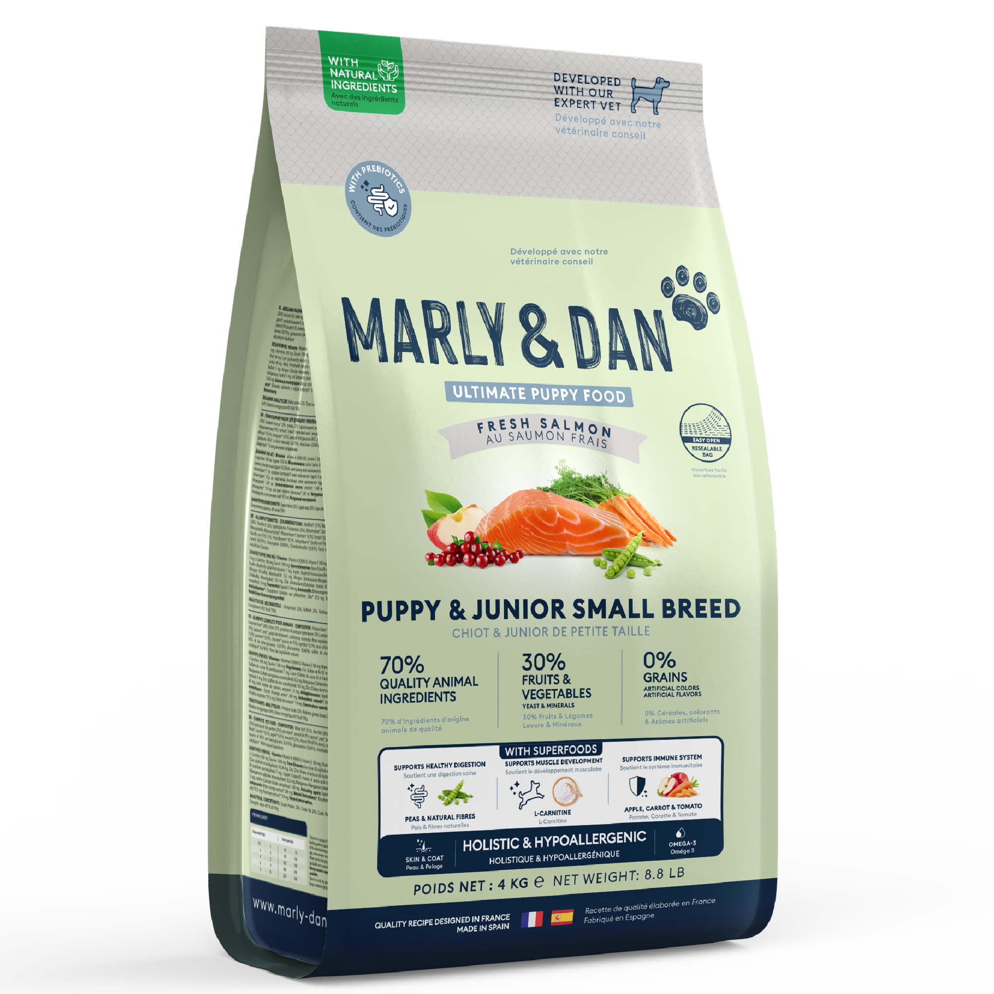 Offrez à votre chiot un départ en pleine santé avec les croquettes naturelles Marly & Dan. Spécialement formulées pour les chiots de petite race, elles sont riches en saumon frais, source de protéines digestes et d’oméga-3 pour soutenir la croissance, la peau et le pelage. Sans céréales, elles respectent le système digestif encore fragile des jeunes chiens. Leur petite taille facilite la mastication et l'assimilation des nutriments essentiels.