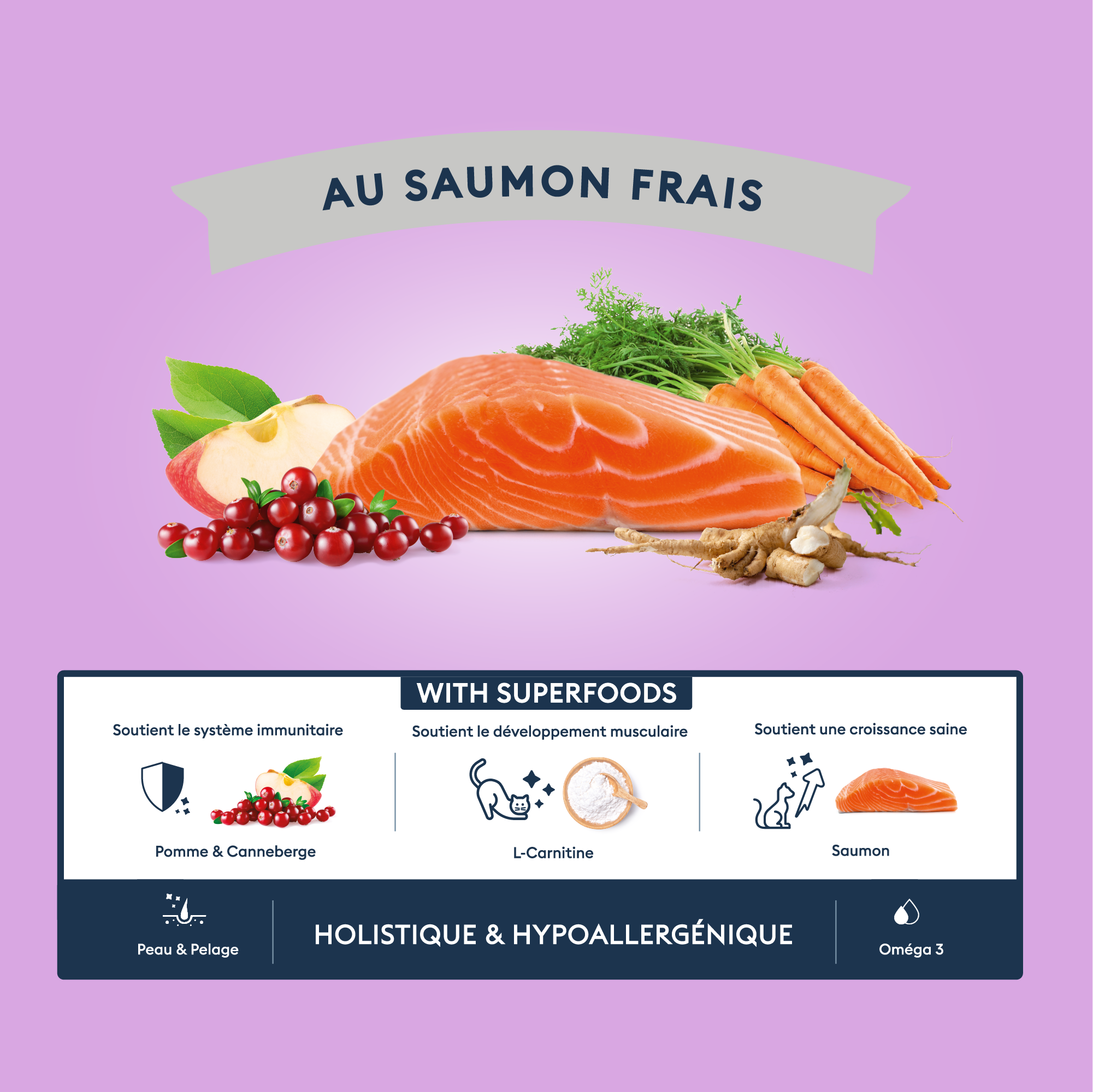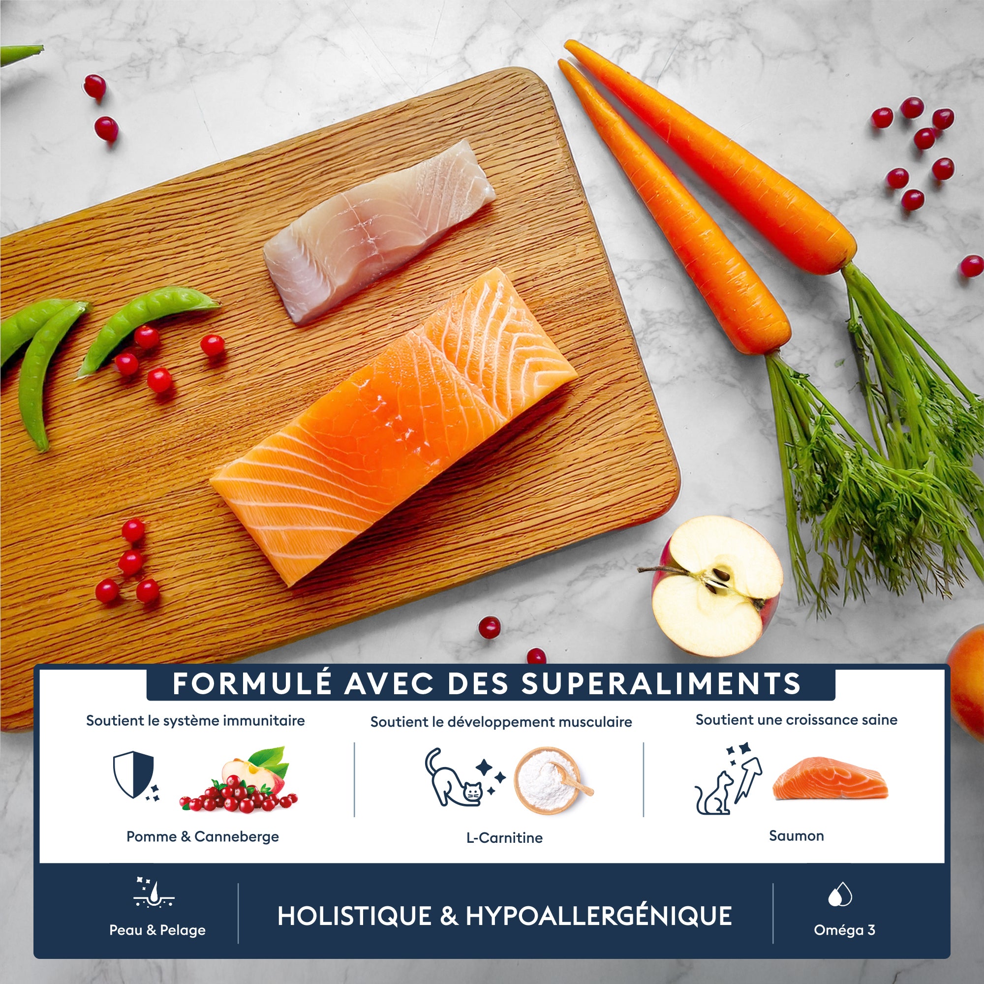 Poisson blanc (34%), saumon frais (26%), pomme de terre, amidon de pois, graisse animale (7%), pois, protéines de poisson hydrolysées (3%), minéraux, pulpe de betterave, fibres végétales, chicorée (source de FOS), carottes (0,5%), tomates (0,5%), pommes (0,5%), canneberges (0,1%), parois cellulaires de levure (source de MOS et de bêta-glucanes) (0,075%), Yucca Schidigera (0,018%). Vitamines : Vitamine A 30000 UI, Vitamine E 500 mg, Vitamine C 250 mg, Biotine : 3 mg, L-Carnitine 300 mg, Taurine 1500 mg. Oligo-éléments : Fer (sulfate de fer (II) monohydraté) 64 mg, Zinc (sulfate de zinc monohydraté) 102,96 mg, Zinc (chélate de zinc d'acides aminés hydraté) 40 mg, Cuivre (sulfate de cuivre (II) pentahydraté) 7 mg, Cuivre (chélate de cuivre (II) d'acides aminés hydratés) 3 mg, Manganèse (sulfate de manganèse monohydraté) 35,2 mg, Manganèse (chélate de manganèse d'acides aminés hydratés) 5 mg, Iode (iodate de calcium anhydre) 1,49 mg. Acides aminés : sel de calcium de l'hydroxy-analogue de méthionine 2520 mg. Antiagglomérants : Sépiolite : 1144 mg. Composés aromatiques : Extrait de romarin 114 mg, Extrait d'orange amère 240 mg. Antioxydants naturels : Extraits de tocophérol d'huiles végétales 97,3 mg. Conservateurs naturels. Valeur énergétique : 398 Kcal/100g